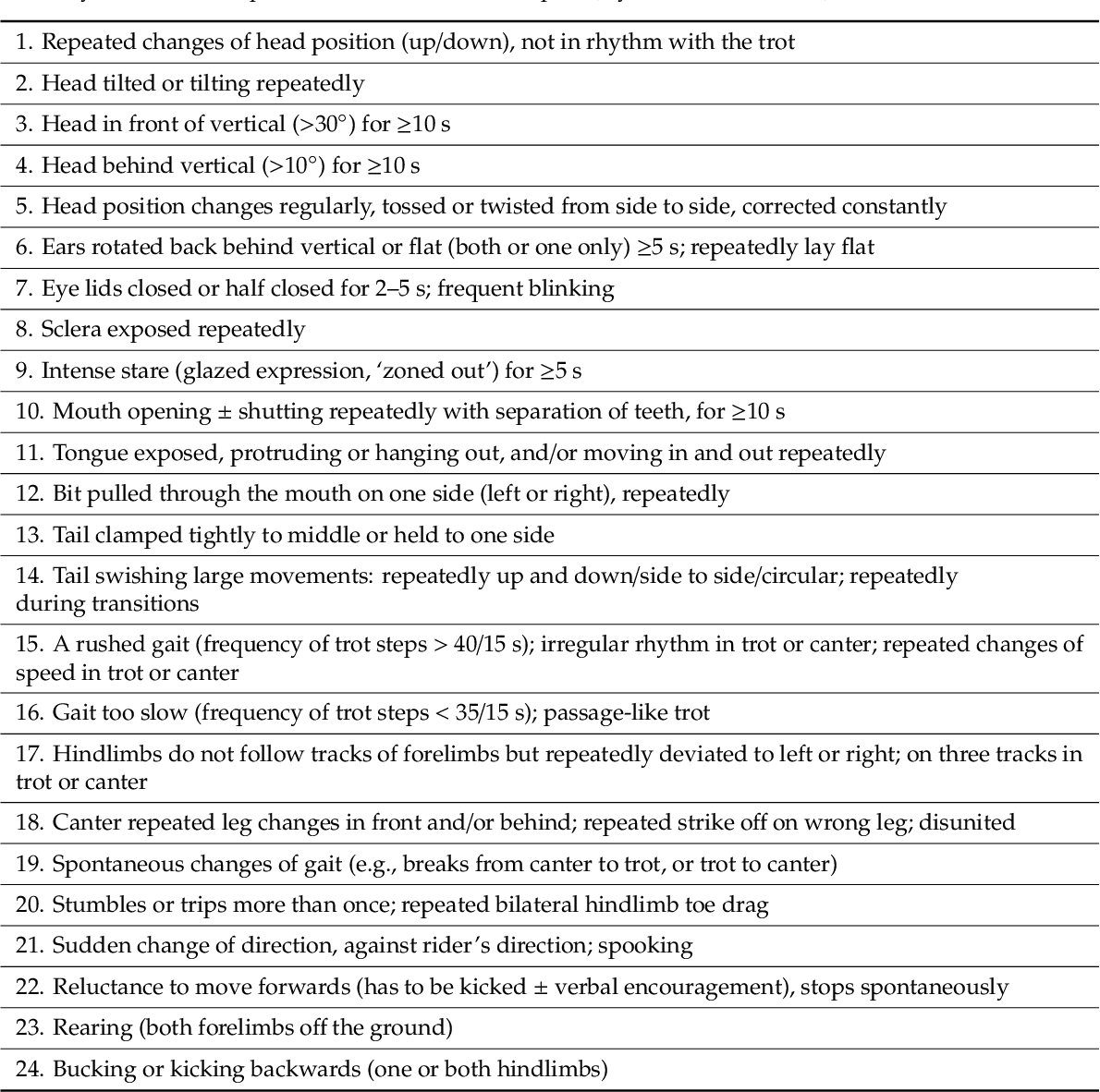 When the RHpE has been applied to Grand Prix dressage horses (Dyson & Pollard, 2021), it was found that the average score was 3/24, but ranging from 0- 7/24 (8/24 is regarded as the threshold for pain in horses). The most frequent of behaviours were: